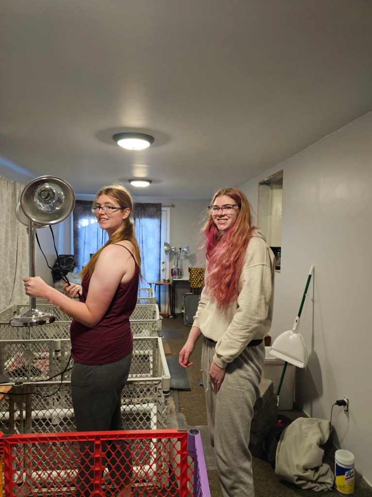 Changing out the large whelping pads under their whelping pens several times a week is a must! This is a big job, but worth it for healthy happy puppies.