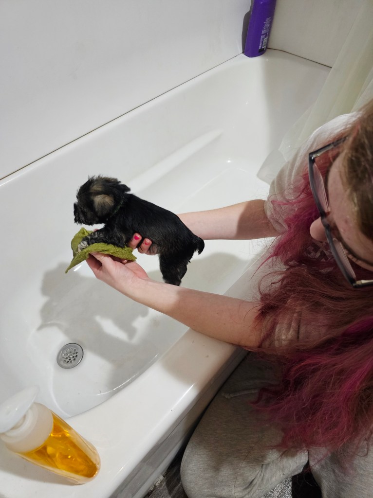 We begin washing puppy feet each day (sometimes a few times a day) once they start using their pee pads to go potty on.