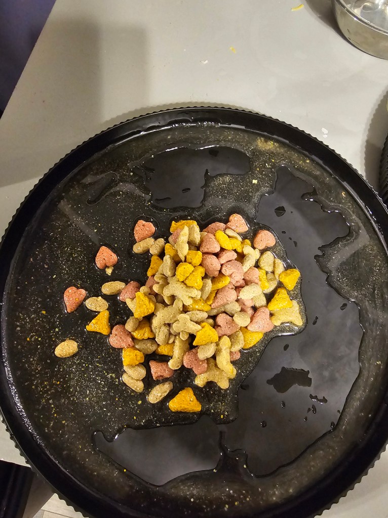 After getting the food super soft, we mush it with a fork until it is in tiny pieces. This makes it easier for the puppies to eat with little to no teeth.