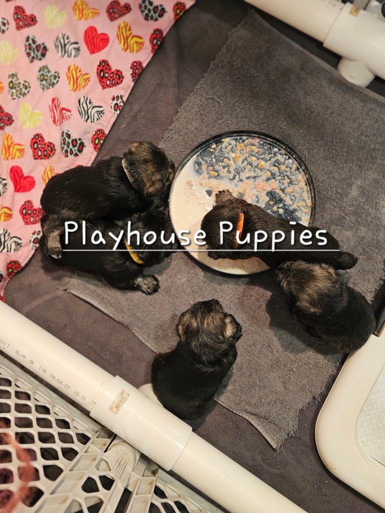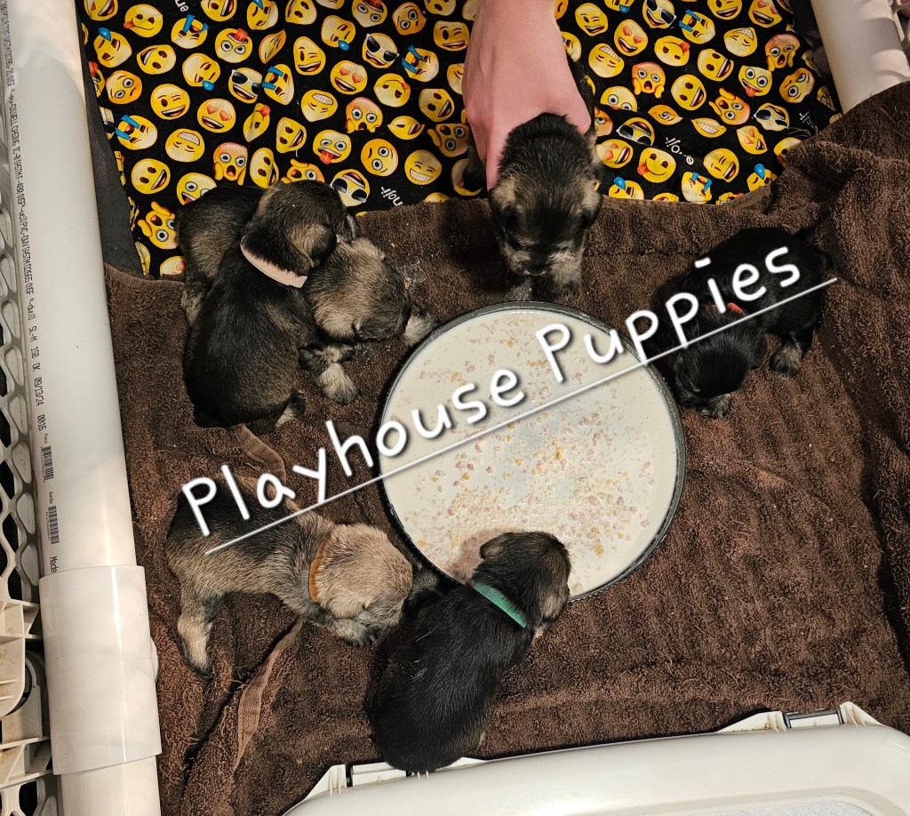 Most puppies let us know when they are ready to begin puppy mush by sticking their heads in mommas bowl. This usually happens between week 3 and week 4.